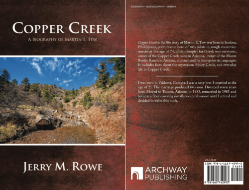 I Am a retired floor covering installer. I was married and have five boys. My wife passed away in February 2011. I also make southwestern greeting cards. I have written four other books, “A history of Sahuarita”, “Copper Creek”, “Arizona Hidden Treasures”, and “Woman on the Move”. I am a deacon at my church. I live alone in Three Points, Arizona.